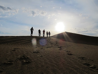We rode camels on the evening when the sky was clear again and the twilight sun faced the moon for a couple of hours. We rode the camels until we got to wet sand dunes that popped in the middle of the grass and then we came back to the gers.