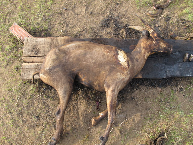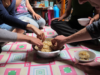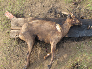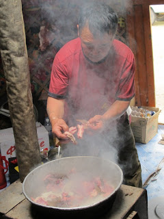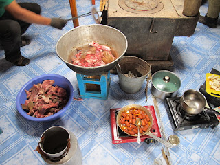 The father of the family that received us there seemed very glad with the goat and the prospect of doing a hot pot and they killed it while we were exploring around... By the time we came back the goat was clean, the little girls of the family were playing with it, and our guide was again preparing inside meat sausages (not our meal this time).