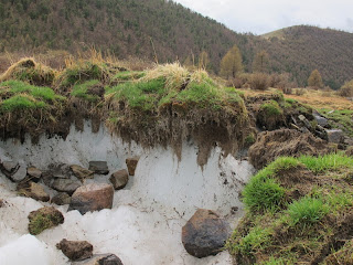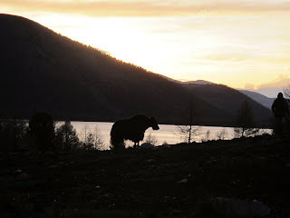 We got dry there, and ironically it stopped raining for the rest of the day. The little boy of the family was glad to show us the sights of the place. Everything was bright green because of the rain and the yaks moving slowly into the twilight added a surrealistic flavor to the view. There was a small frozen body of water and also pieces of ice that broke the earth from underground (I think it’s called permafrost). And maybe one kilometer after that, a big transparent lake under the mountains.